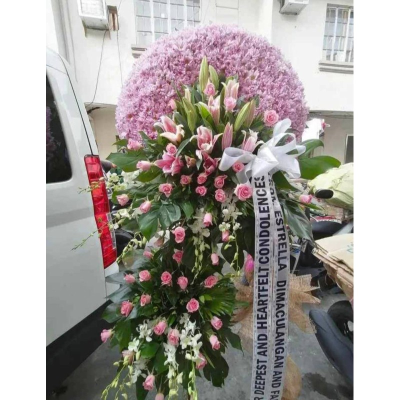 Fresh pink malaysian mums, pink roses, stargazers and white orchids wreath flowers arrangement.