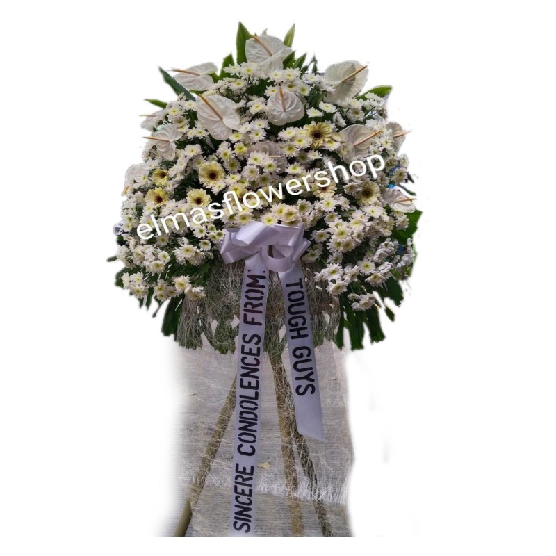 Fresh white radus, white anthuriums and gervera funeral standee flowers arrangement.