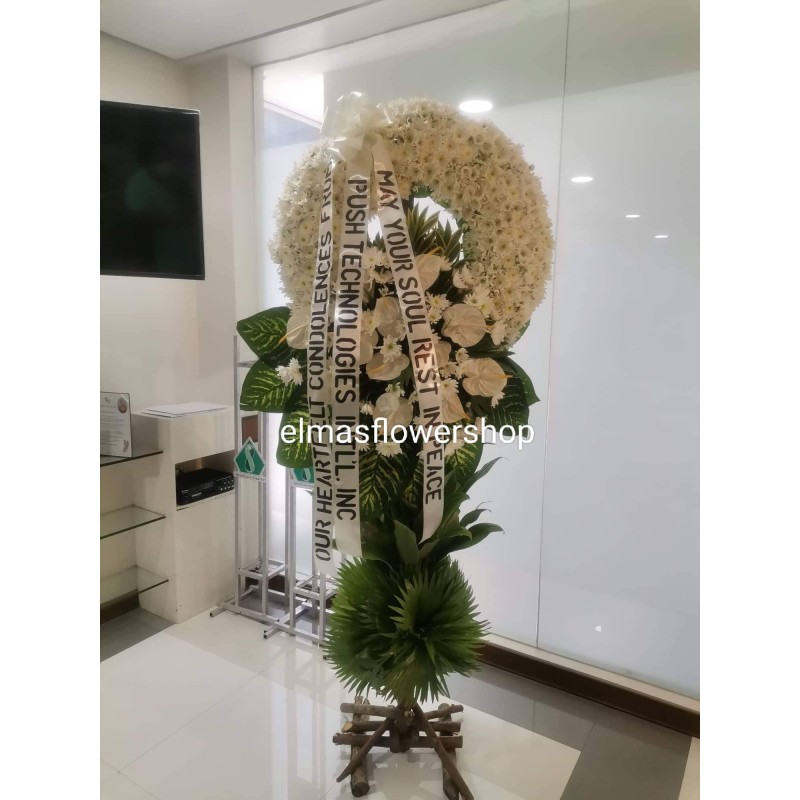 fresh white radus, antoriums and leaves funeral arrangement. 6ft-7ft height.