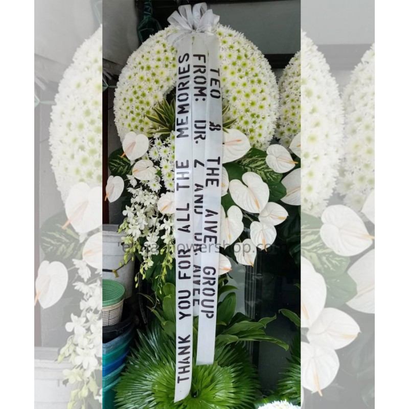 Fresh white mums, white anthuriums, white orchids wreath flowers arrangement. 7ft-8ft high.