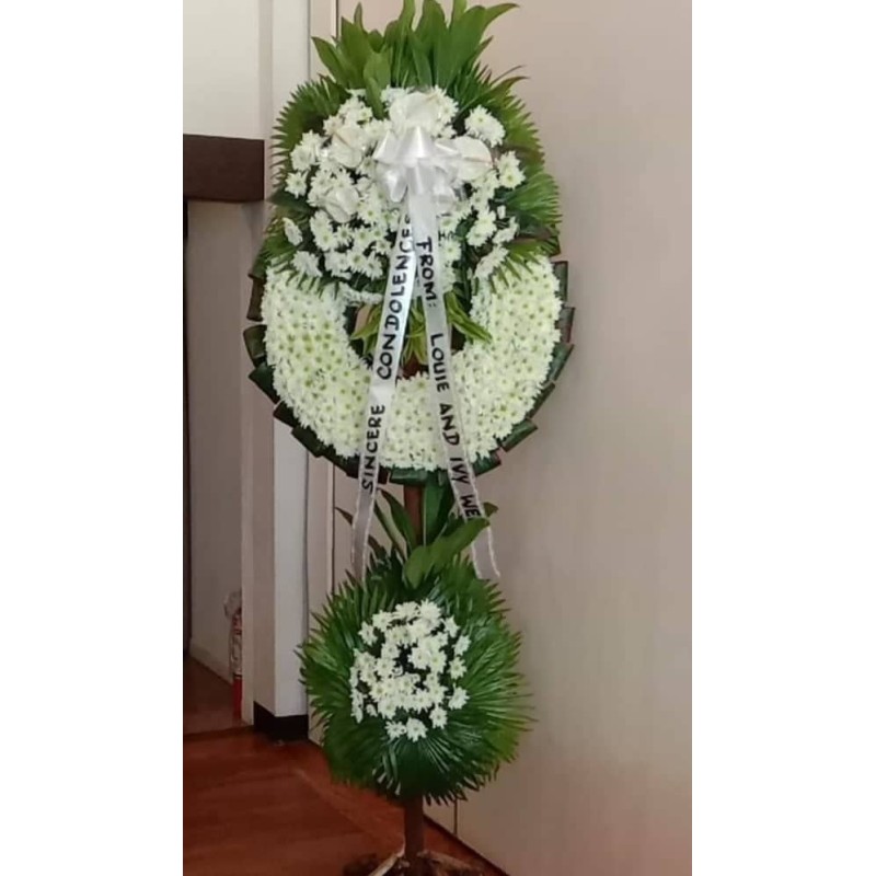 Fresh white mums, white anthuriums and leaves wreath flowers arrangement. 7ft-8ft high