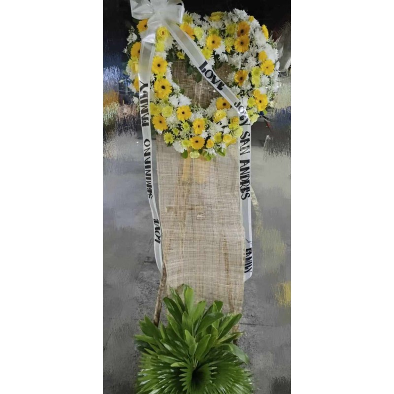 Fresh white Gimba flowers, yellow radus, carnations, and gerbera funeral stand flowers arrangement. viber/whatsapp: 09483937585
