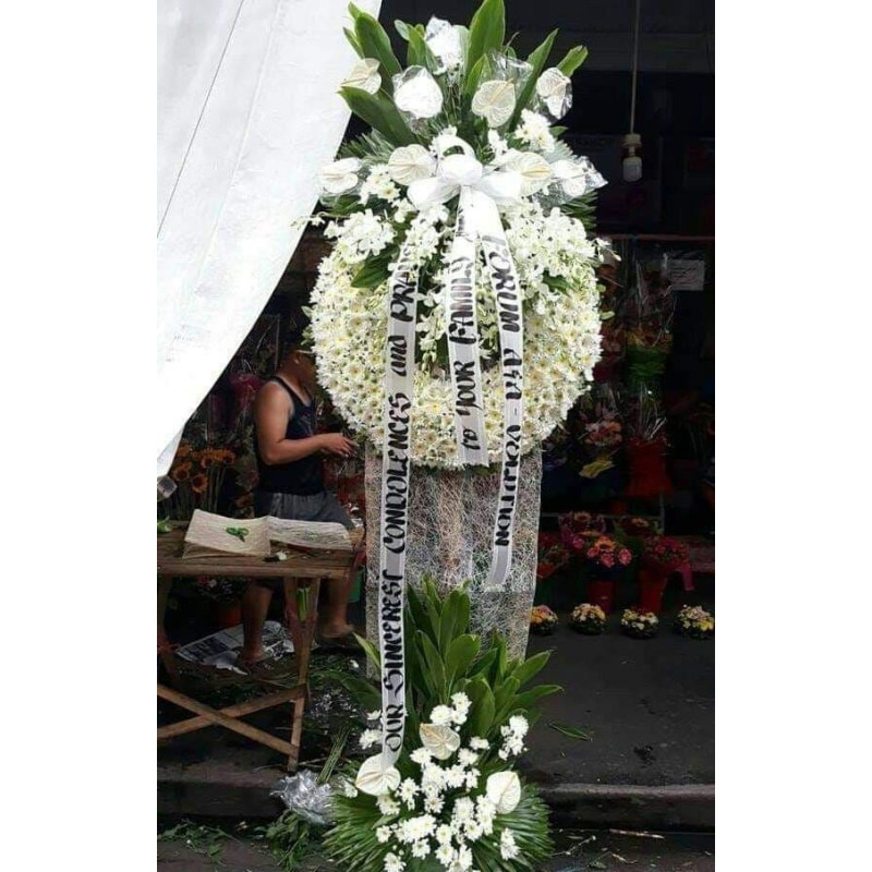 Fresh white orchids, radus, anthuriums and leaves funeral arrangement. 7ft-8ft high