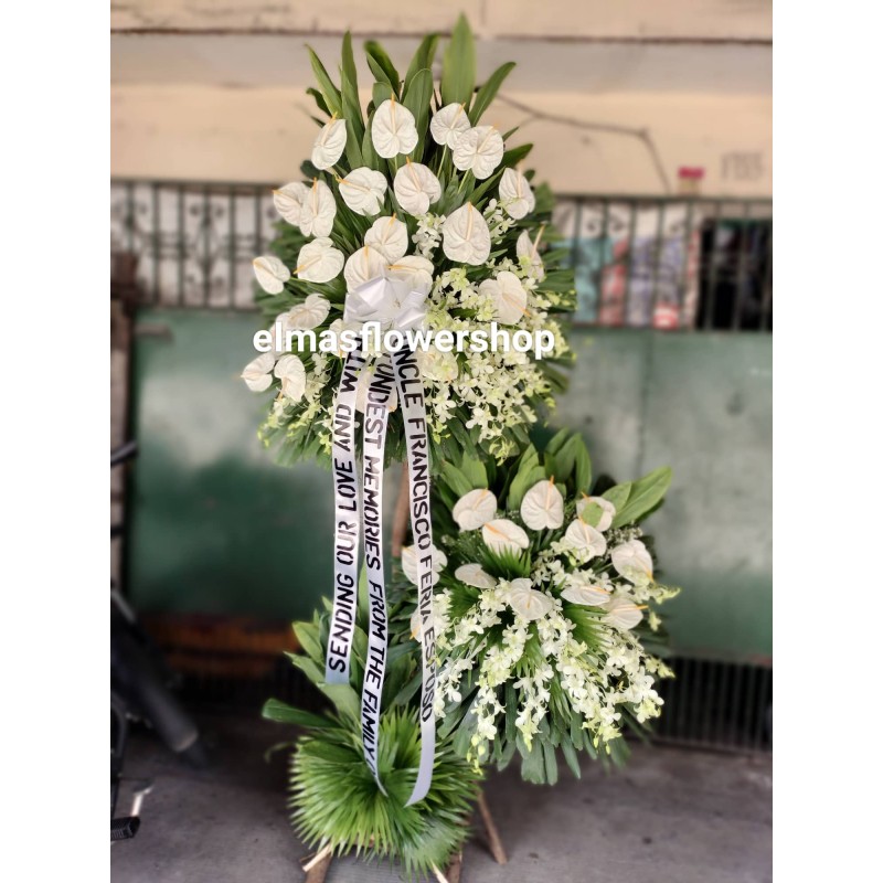 Fresh white antoriums, white orchids and leaves 3layered funeral stand arrangement. 7ft-8ft high