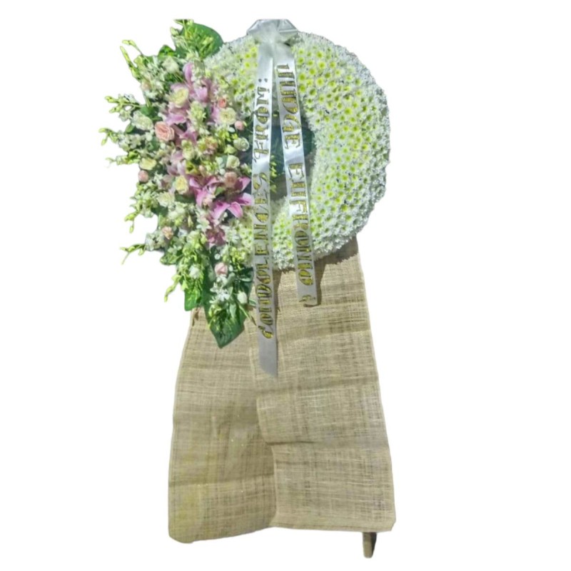 Fresh white radus, white orchids, roses and stargazers wreath funeral flowers arrangement.