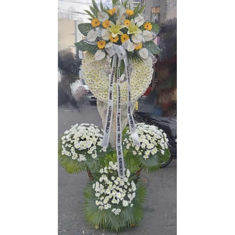 Fresh white mums, white anthuriums, yellowin and gerberas wreath funeral flowers arrangements. viber/whatsapp: 09483937585