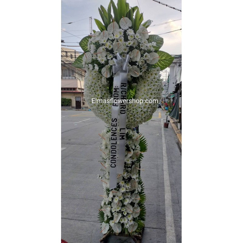 Fresh white mums, antoriums and leaves funeral standee arrangement. 7ft-8ft high