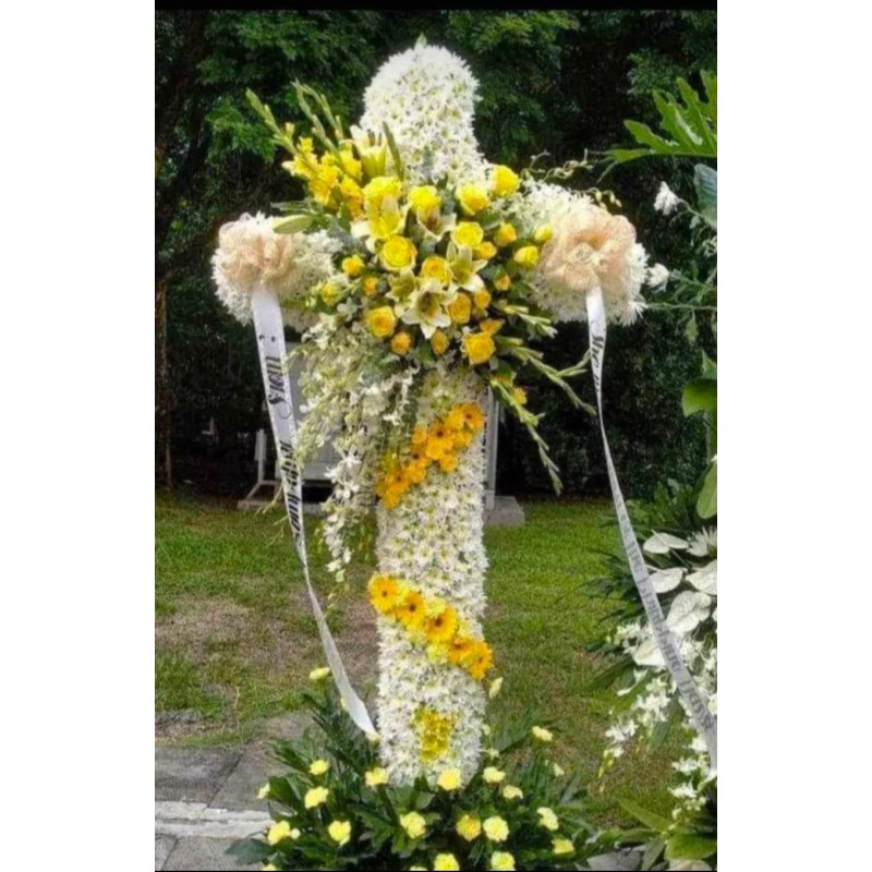 Fresh white radus, imported yellow roses, yellow gervera, yellowin and white orchids wreath cross flowers arrangement.