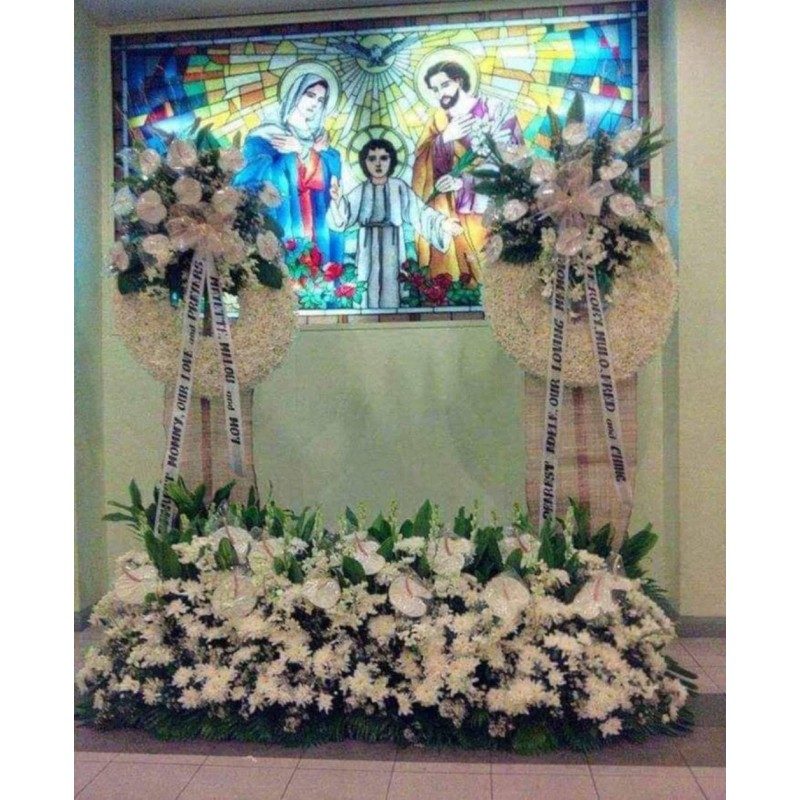 Fresh white antoriums, orchids, mums, and leaves funeral garden arrangement.