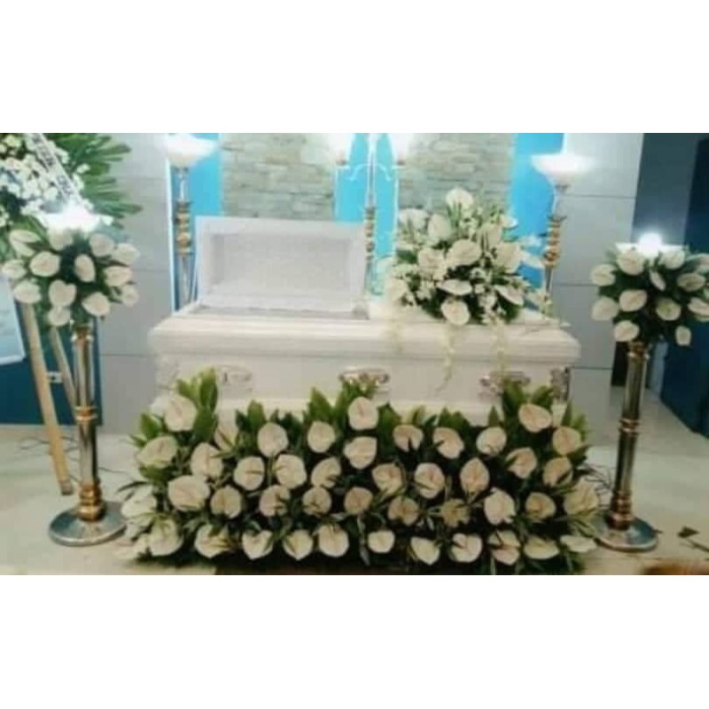 Fresh white antoriums, orchids and leaves funeral garden arrangement.