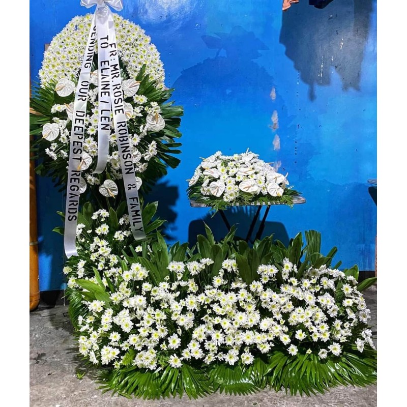 Fresh white mums, white anthuriums garden flowers funeral arrangement.