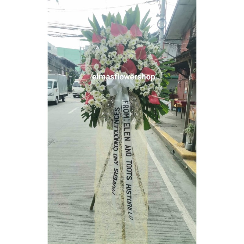 Fresh white mums and pink anthuriums funeral stand arrangement.