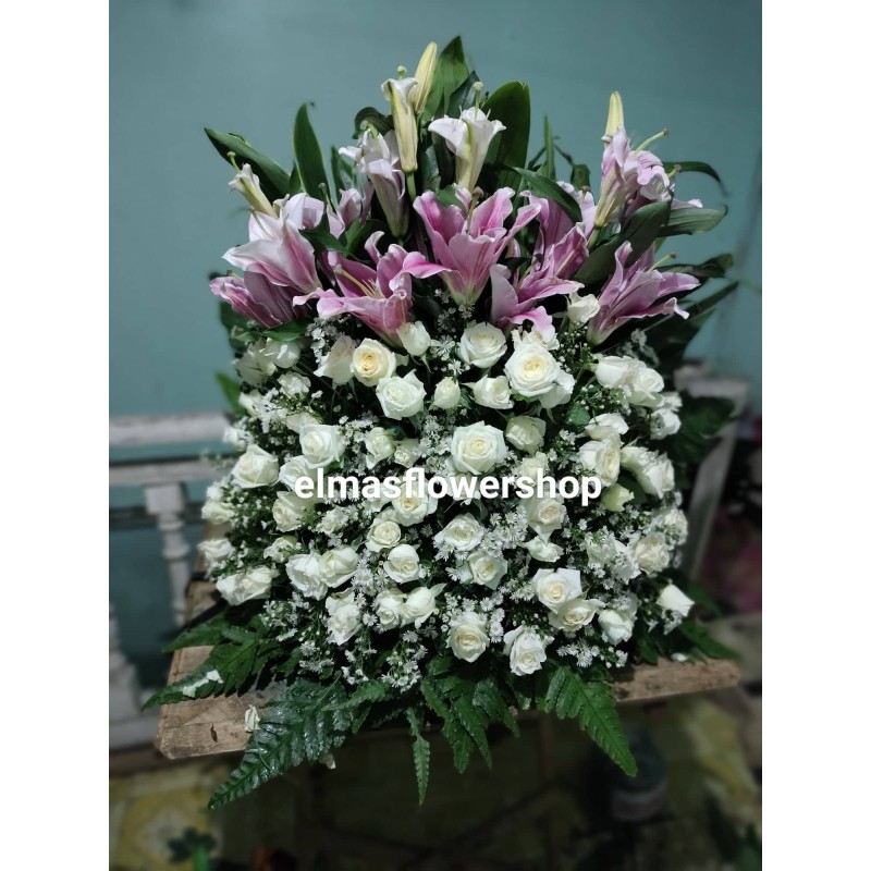 Fresh white roses, stargazer, aster and leaves basket/paso arrangement.
