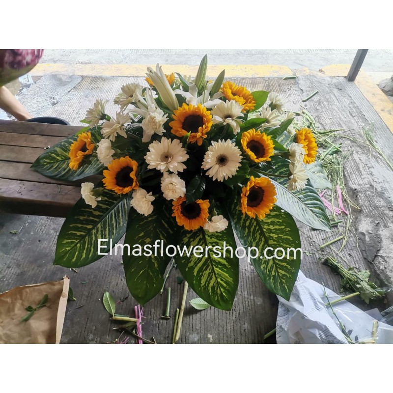 Funeral CasketSpray arranged from fresh sunflowers,gervera, casa blanca and leaves.