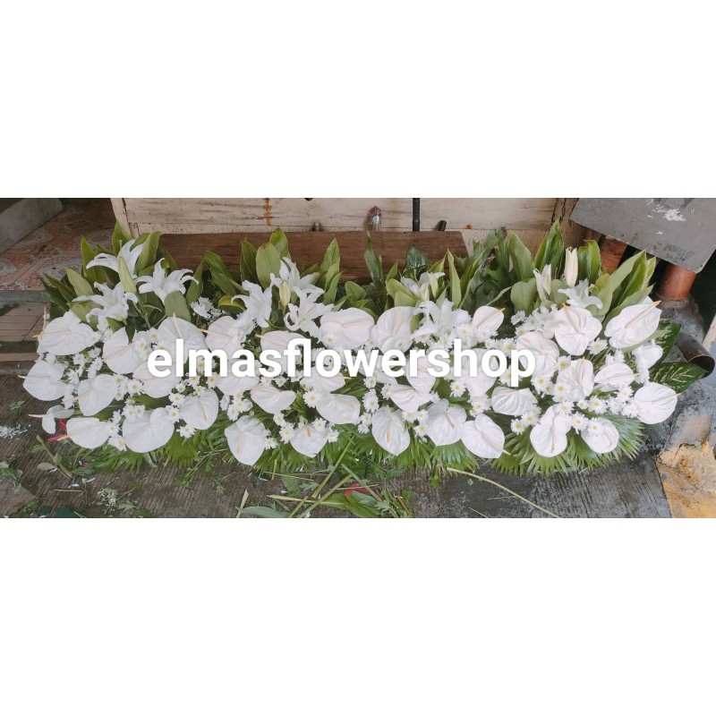 Fresh white mums, anthuriums, casa blanca and leaves funeral garden arrangement.