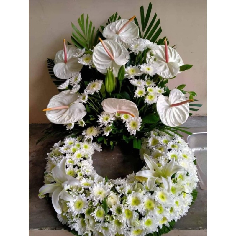 Fresh white antoriums, mums, casa blanca and leaves urn funeral arrangement.