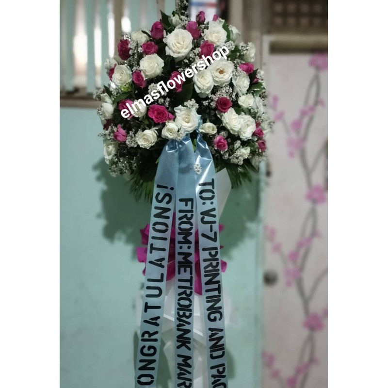Fresh white and pink roses and aster inaugural, opening, blessing flowers stand arrangement.