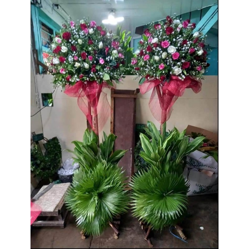 Fresh white, red and pink roses and white aster inaugural, opening, congralatury, blessing flowers arrangement. 2pcs stand free ribbon cutting.