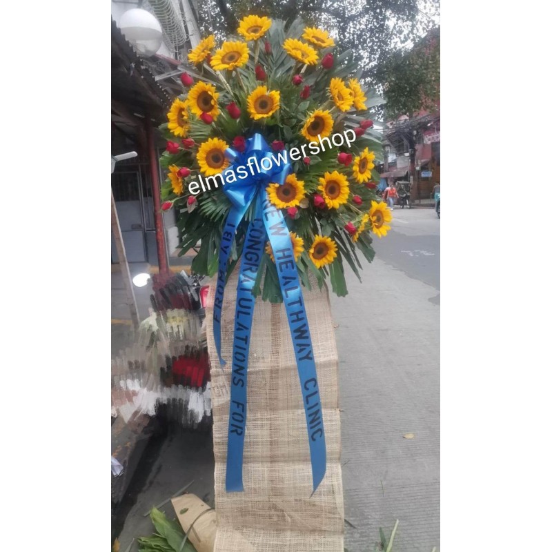 Fresh sunflowers and red roses inaugural, opening, congralatury flowers arrangement.