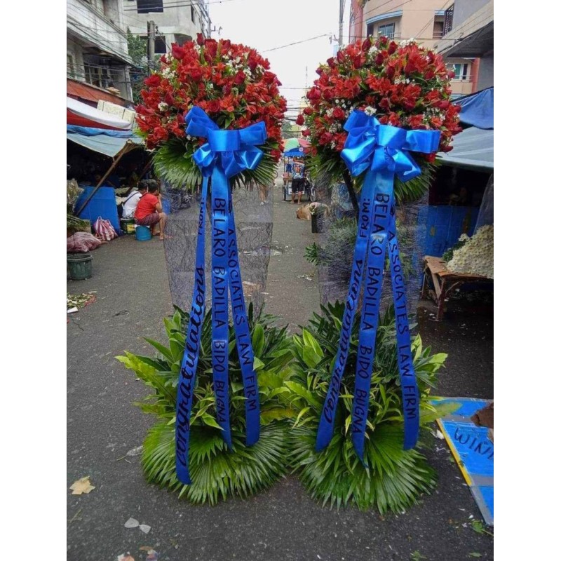 Fresh red roses, red astromeria and aster opening, inaugural or blessing standee flowers. sold for 2pc stand free ribbon cutting.