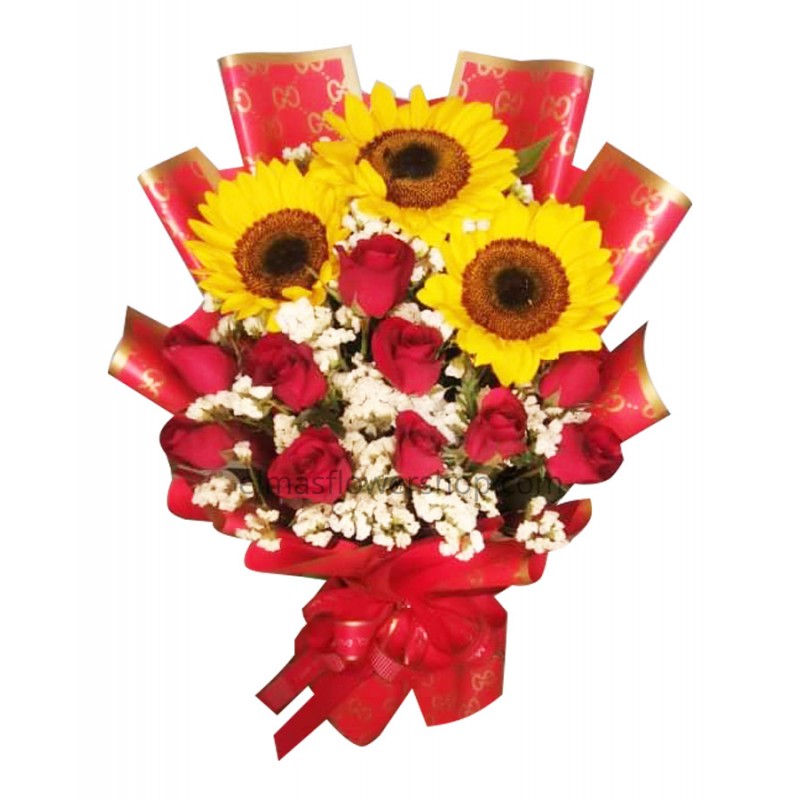 3pcs fresh Sunflowers, 12pcs fresh roses and fresh fillers bouquet